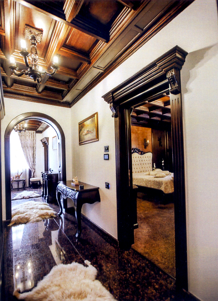 Peretii si plafonul casetat sunt finisate cu lemn masiv de fag si tei, in compozitia carora apar mai multe elemente decorative, lucrate manual. Aceasta abordare are dublu rol: decorativ si termoizolant.