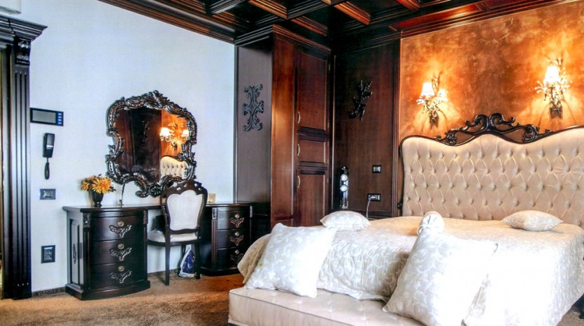 Patul de marime „king size” este piesa cea mai importanta din incapere. Acesta este incadrat de peretii placati cu lemn in centru carora este valorificat finisajul de stucco venetian.