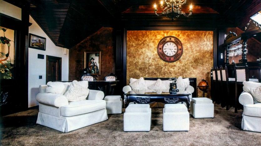 Peretele principal este finisat cu stucco venetian in nuanta potrivita acestei camere, pardoseala este acoperita cu mocheta Vorwerk si tavanul este casetat din lemn masiv de fag si tei.