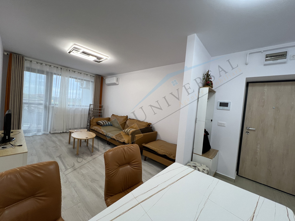 Apartamentul beneficiaza de finisaje de calitate, pardoseli placate cu gresie in baie si bucatarie, pardoseli placate cu parchet in living, dormitor si hol, tamplarie pvc cu geam termopan, placi ceramice intre blatul de lucru si dulapul superior in bucatarie, pereti placati cu placi ceramice in baie, usi interior lemn, usa metalica la intrarea in apartament, un aparat de aer conditionat.